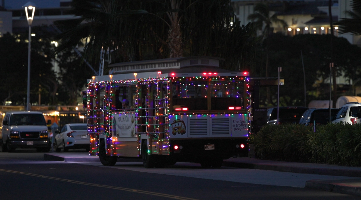 ホーリー ジョリー ワイキキ トロリーに乗って、ホリデーライトの輝きと華やかな雰囲気を満喫しましょう。