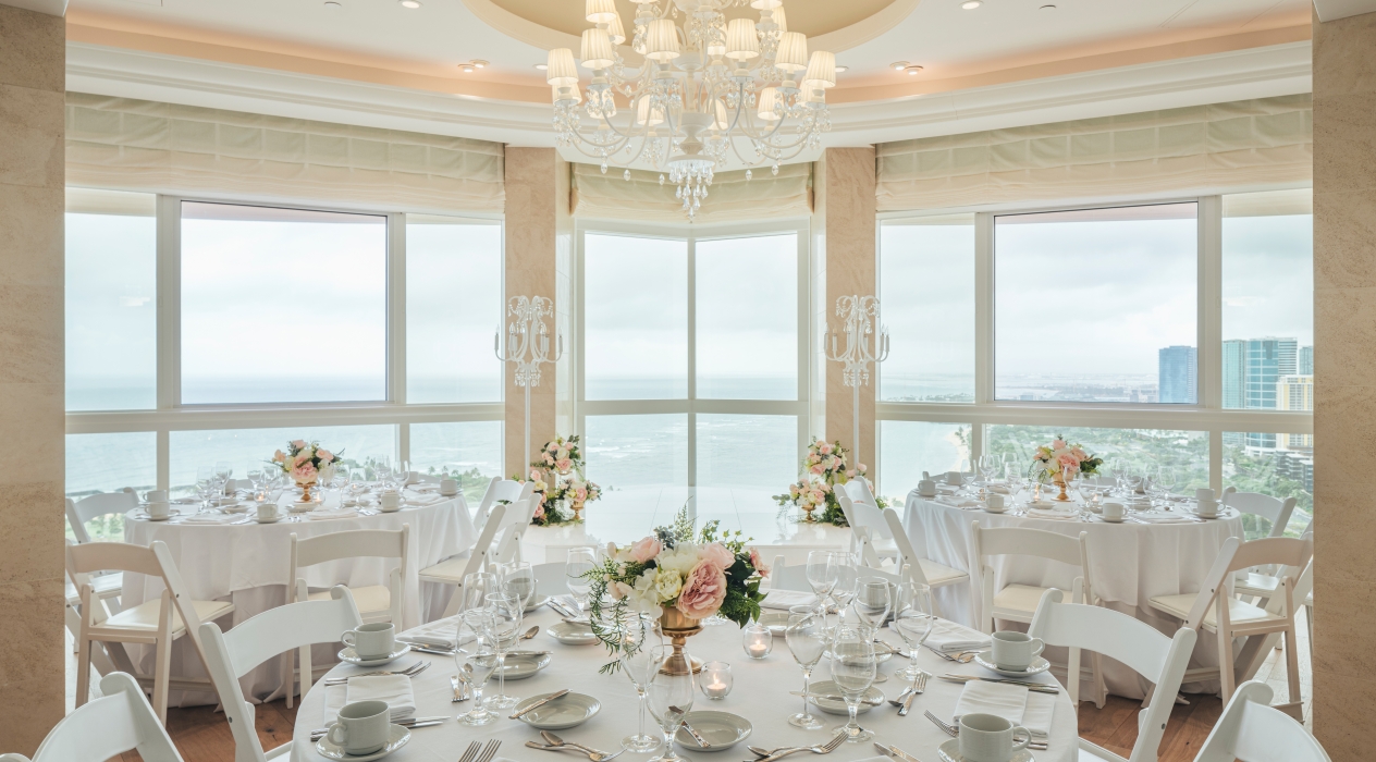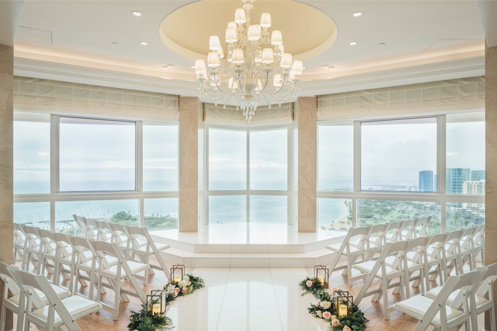 33階からの遮るもののない壮大な太平洋の眺め。「ラニ・レア・チャペル」は、親密な集まりに最適なセッティングを提供いたします。