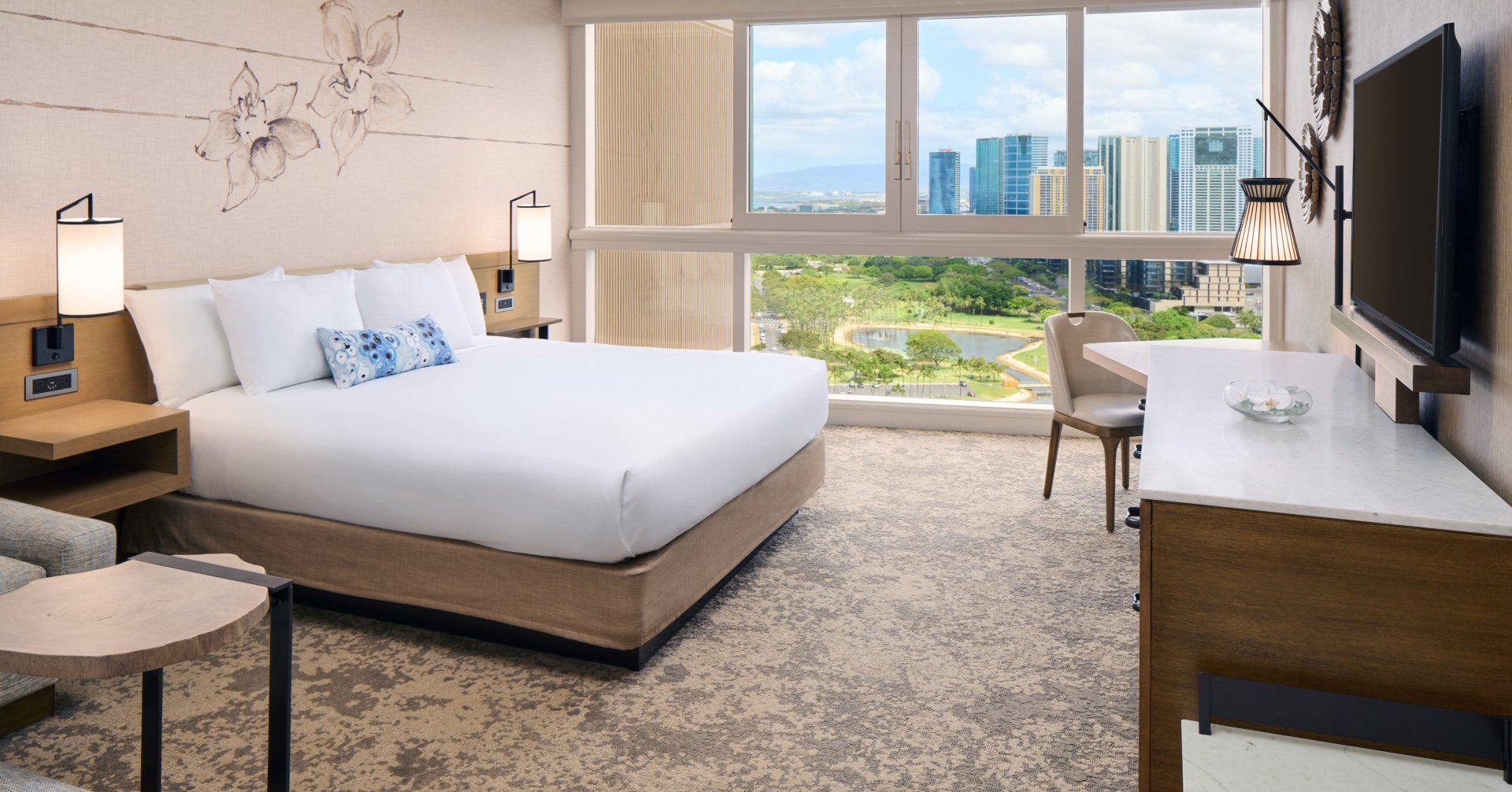 ヨットハーバーからアラモアナビーチパークまで見渡すオーシャンビューとアラモアナセンターを一望できるシティビューの両方を兼ね備えた、リゾートな雰囲気あふれる景色を開閉式のパノラマウィンドウからお楽しみください。