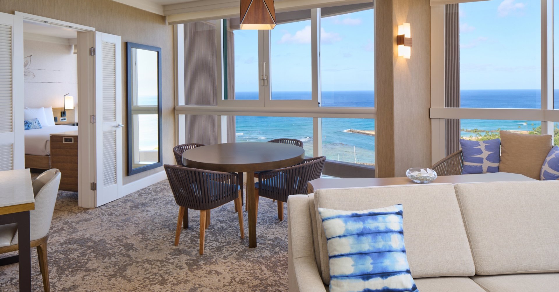 2つのベッドルームがあるオーシャンフロント スイートは、広々としたラグジュアリースイート。ワイキキビーチ、ヨットハーバー、そしてその先のどこまでも広がる太平洋の絶景をリビングルーム全面に広がる開閉式のパノラマウィンドウからお楽しみいただけます。足元から天井までの窓が、広々としたリビングルームをドラマチックに演出。