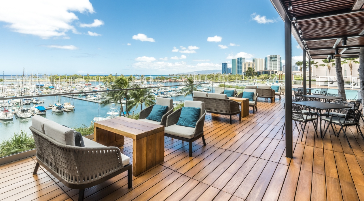 - 広大な太平洋、ヨット ハーバー、そしてインフィニティプールを見渡す屋外テラス